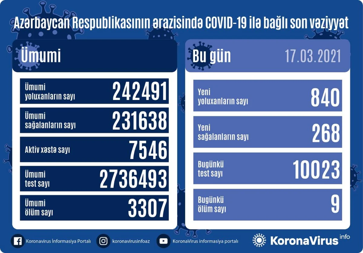 Azərbaycanda koronavirusa daha 840 nəfər yoluxub, 9 nəfər ölüb