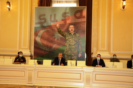 "Report"un xəbərinə görə, Bakı Şəhər İcra Hakimiyyətinin başçısı Eldar Əzizov qonaqları salamlayaraq bildirib ki, ölkə başçısı, Silahlı Qüvvələrin Ali Baş Komandanı İlham Əliyev ildırım sürətli 44 günlük Vətən müharibəsində özünü dahi ictimai-siyasi xadimdən əlavə həm də bacarıqlı sərkərdə kimi göstərib: