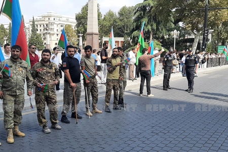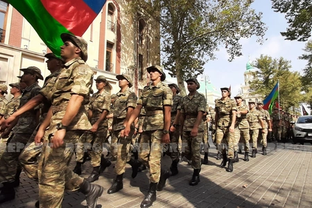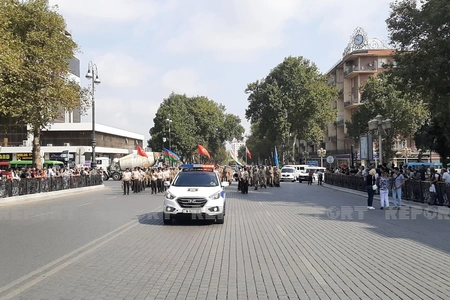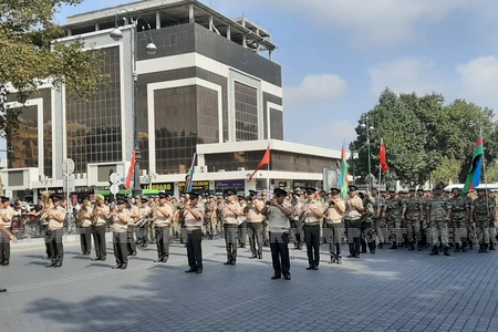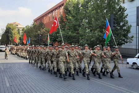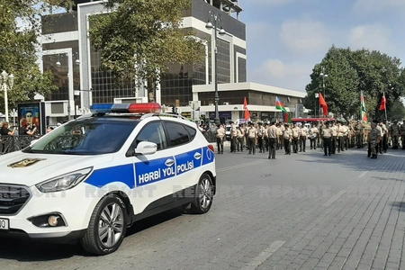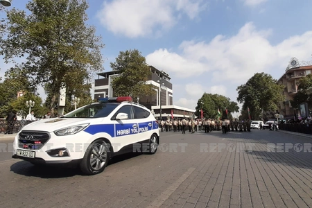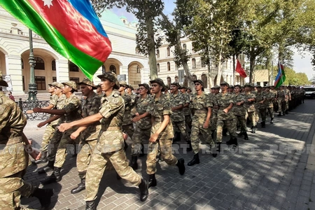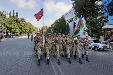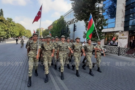 Gəncə şəhərində hərbi orkestrin müşayiəti ilə hərbi qulluqçuların təntənəli yürüşü başlayıb.