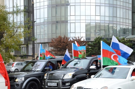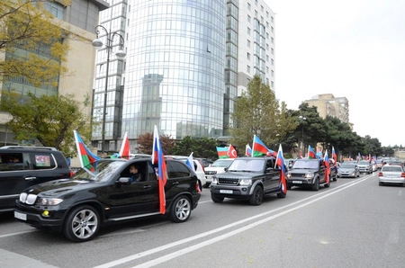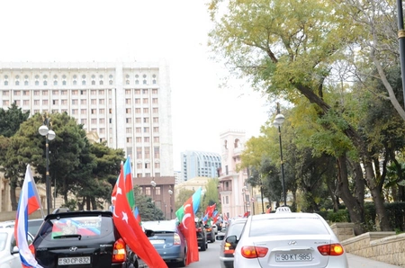 “Report”un xəbərinə görə, avtomobillərin üzərinə Azərbaycan, Türkiyə və Rusiya bayraqları asmış yürüş iştirakçıları “Kəlbəcər azaddır”, “Qarabağ Azərbaycandır!” şüarları səsləndirirlər.