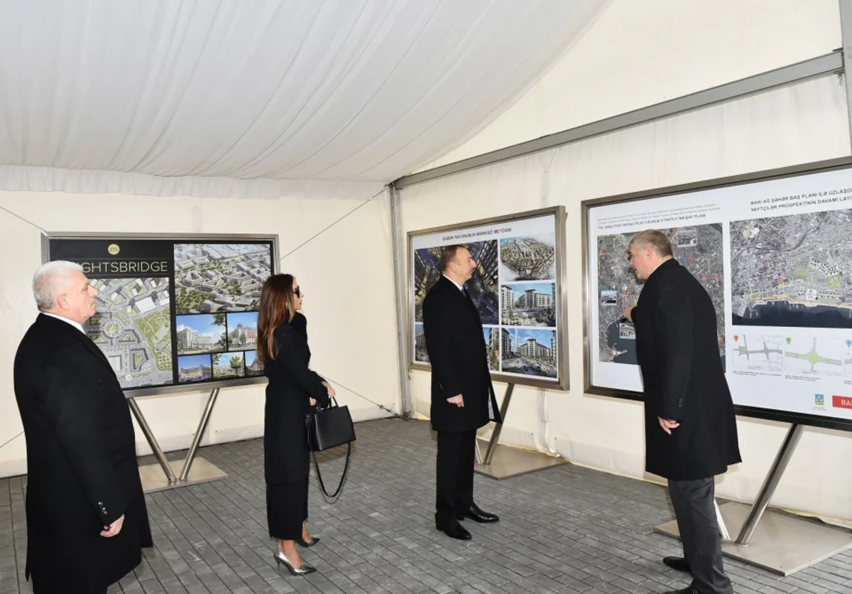 Daha sonra Prezident İlham Əliyev və xanımı Mehriban Əliyeva “Bakı Ağ Şəhər” çərçivəsində layihələndirilən Fəvvarələr Meydanı parkı, piyada keçidi və ictimai parkinq kompleksinin təməlqoyma mərasimində iştirak ediblər.