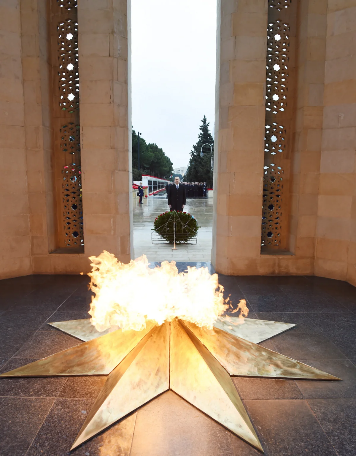“Report” xəbər verir ki, dövlət başçısı “Əbədi məşəl” abidəsinin önünə əklil qoyub.
