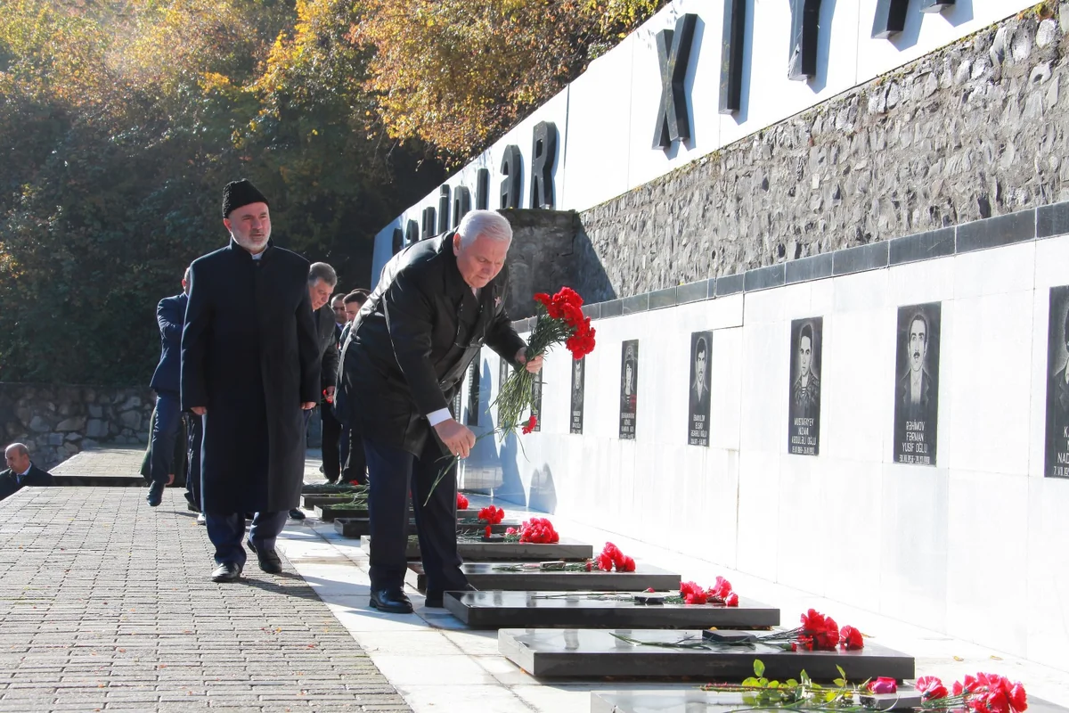 Daha sonra tədbir iştirakçıları Şəki şəhərində yerləşən Heydər Əliyev Mərkəzinin qarşısında ucaldılmış Ulu öndərin abidəsini ziyarət edərək abidəsi önünə gül dəstələri qoyublar.