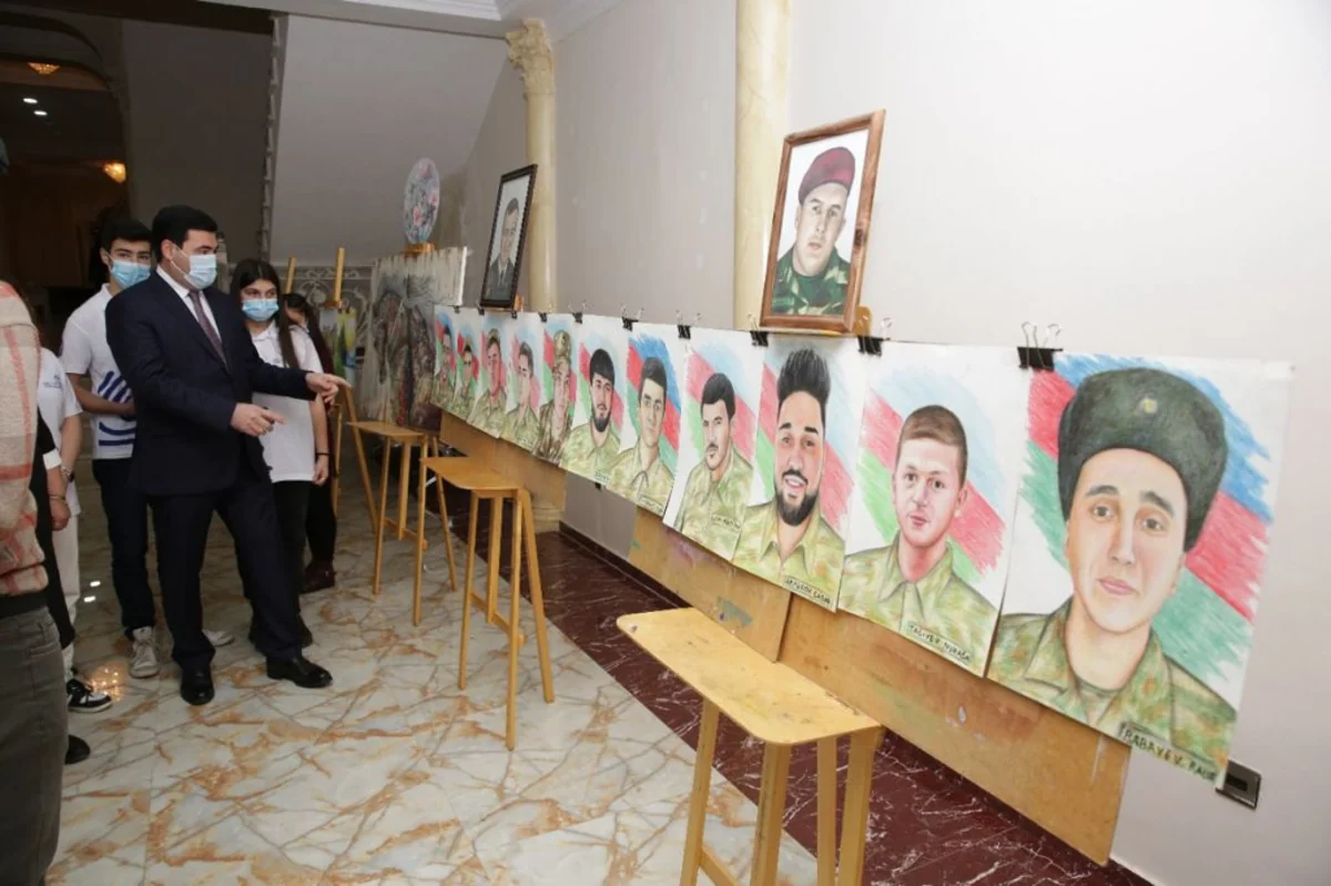 Daha sonra Xaçmaz Şəhər Uşaq İncəsənət məktəbinin yetirmələrinin əl işlərindən sərgiyə baxış keçirilib. Məktəblilər 44 günlük Vətən Müharibəsində şəhid olan xaçmazlı oğulların rəsmlərini canlandırıblar.