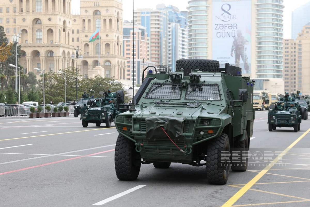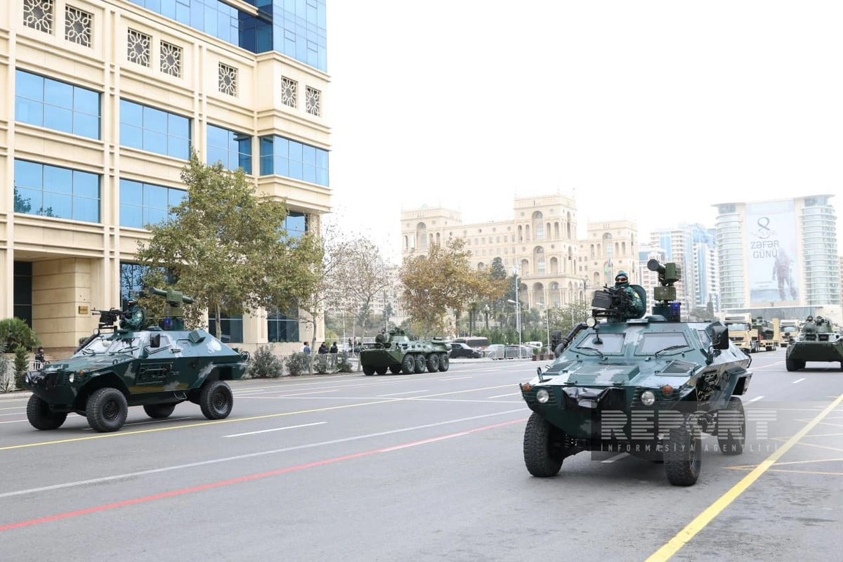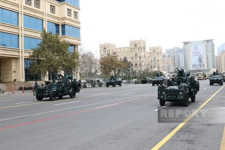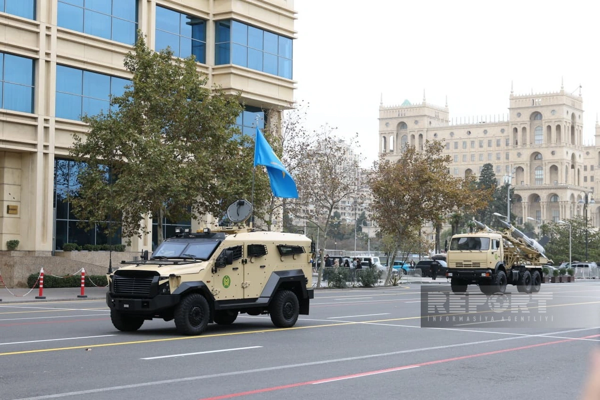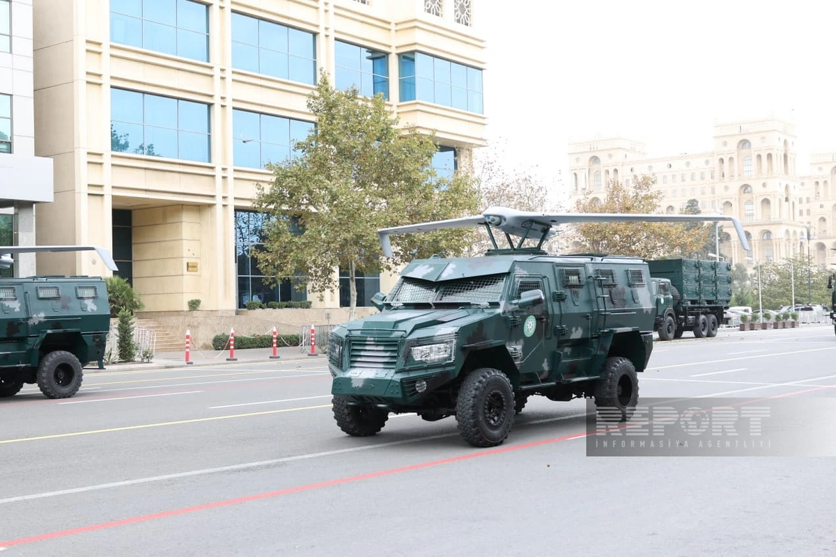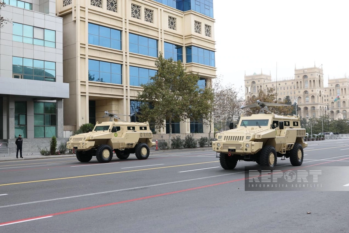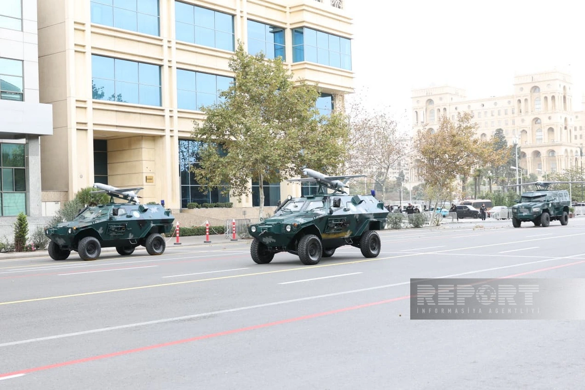 "Report" xəbər verir ki, paradda nümayiş etdiriləcək hərbi texnika, pilotsuz uçuş aparatları və ordunun paradda iştirak etmək üçün seçilmiş şəxsi heyəti meydandan keçid edib.