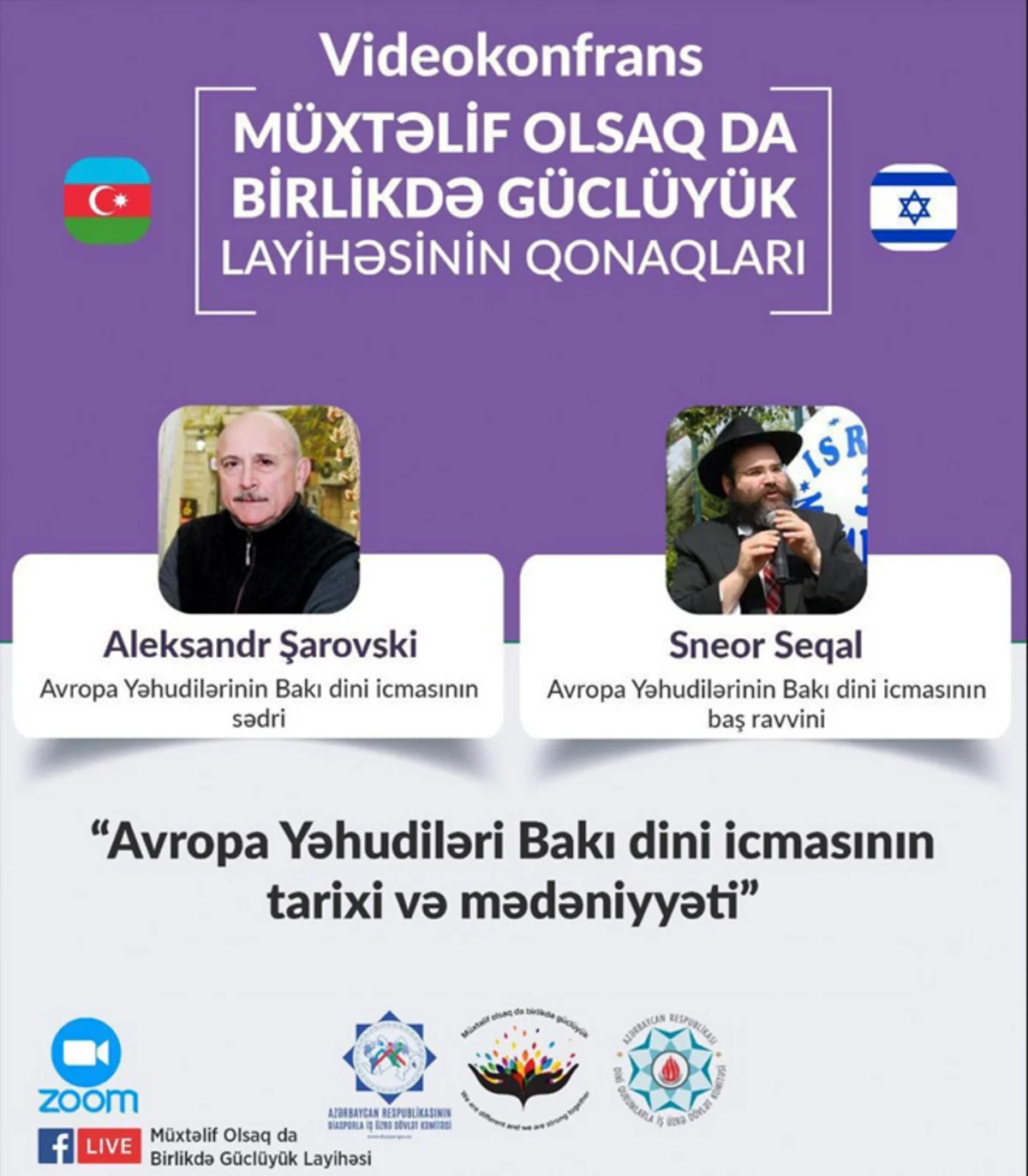 Videokonfrans Diasporla İş üzrə Dövlət Komitəsinin və Dini Qurumlarla İş üzrə Dövlət Komitəsinin təşkilatçılığı ilə keçirilib. "Mənim yolum" Uşaq Mərkəzinin rəhbəri və Nyu-York şəhərinin dağ yəhudi icmasının nümayəndəsi Alyona Bədəlovanın moderatorluğu ilə baş tutan tədbirdə Avropa Yəhudiləri Bakı dini icmasının sədri Aleksandr Şarovski, icmanın baş ravvini Sneor Seqal, Diasporla İş üzrə Dövlət Komitəsinin və Dini Qurumlarla İş üzrə Dövlət Komitəsinin nümayəndələri iştirak ediblər.