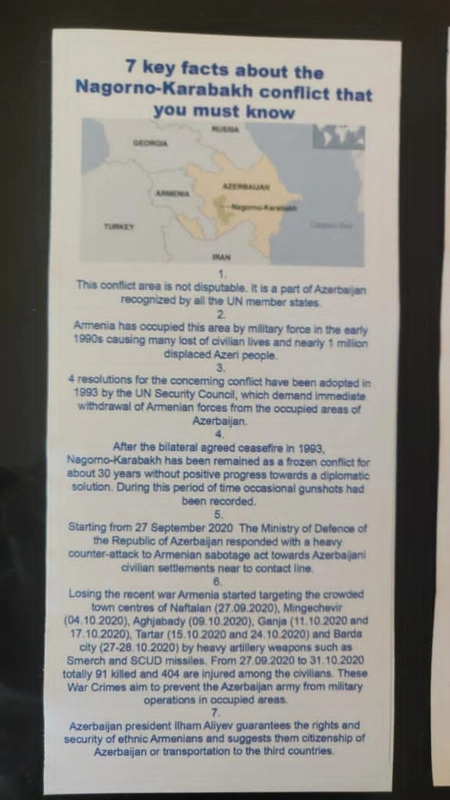Finlandiyada təhsil alan tələbələrin təşəbbüsü və Skandinaviya Azərbaycanlılarının Koordinasiya Şurasının Finlandiya üzrə əlaqələndiricisi, Azər-Türk Gənclər təşkilatının rəhbəri Ülviyyə Cabbarovanın dəstəyi ilə Helsinki şəhərinin Mərkəzi dəmiryolu vağzalının önündə işğalçı Ermənistan ordusunun hərbi təxribatlarını qınayan icazəli aksiya keçirilib.