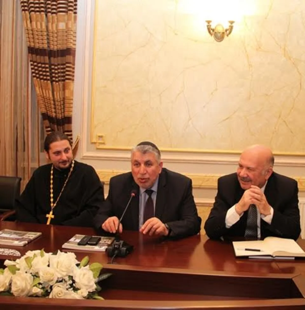 Sonda görüş iştirakçılarına Azərbaycandakı dini abidələrin fotoşəkillərindən ibarət kitab təqdim edilib.