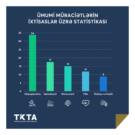 Ən çox müraciət olunan ixtisaslara gəlincə, hüquqşünaslıq üzrə 34, iqtisadiyyat üzrə 17, menecment üzrə 15, tibb 13, maliyyə və kredit üzrə 8 nəfər müraciətçi qeydə alınıb.