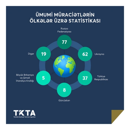 Ölkələr üzrə müraciətlərin sayına nəzər saldıqda Rusiya Federasiyasından 77, Ukraynadan 62, Türkiyə Respublikasından 37, Gürcüstandan 8, Böyük Britaniya və Şimali İrlandiya Krallığından 5, digər ölkələrdən isə 19 müraciətin olduğu müşahidə olunur.