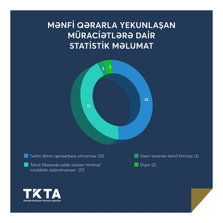 Bildirilib ki, tədris dili üzrə bilik səviyyəsinin qənaətbəxş olmaması səbəbi ilə 33, tədris yükünü mənimsəmək üçün təhsil aldığı ölkənin ərazisində kifayət qədər olmaması səbəbi ilə 27, qeyri-ənənəvi təhsil formasında təhsil alması səbəbi ilə 2, digər səbəblər üzrə 2 nəfərin müraciəti mənfi qərarla yekunlaşıb.