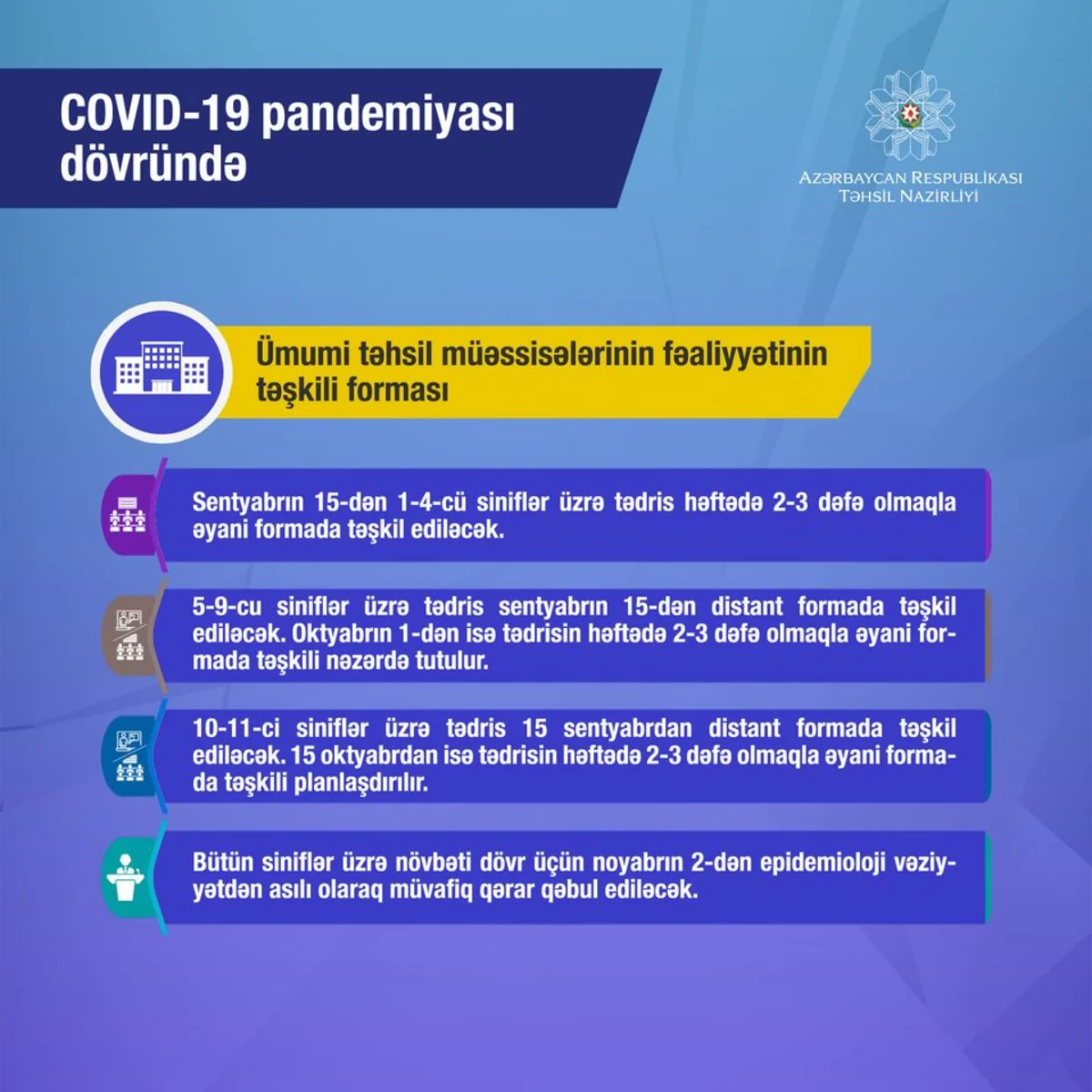 Nazirlər Kabinetinin qərarı ilə COVID-19 pandemiyası dövründə 2020-2021-ci tədris ilində təhsil müəssisələrində dərslərin başlanma tarixi məlum oldu.