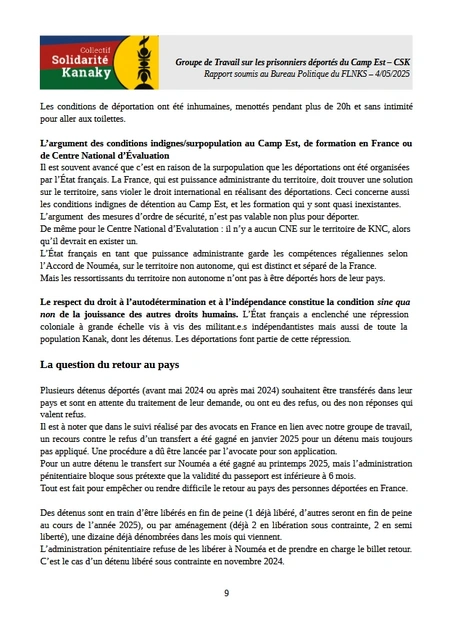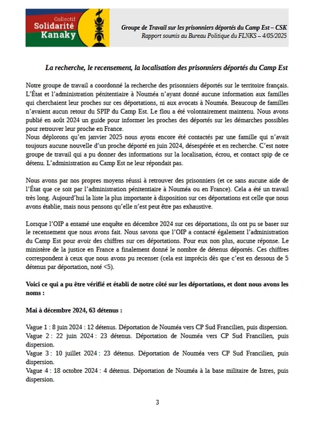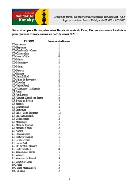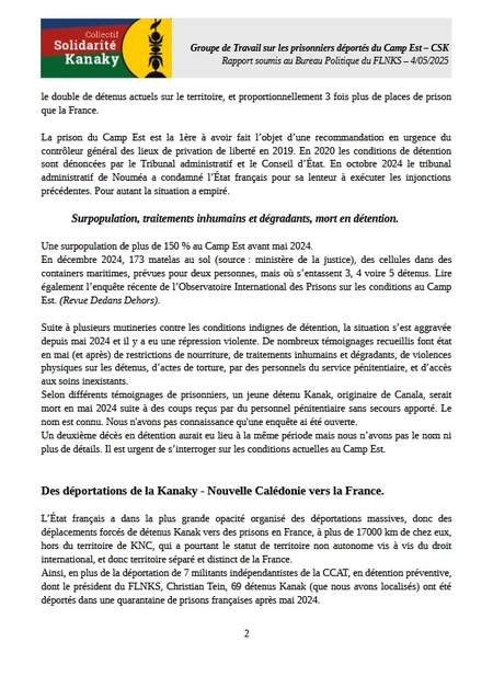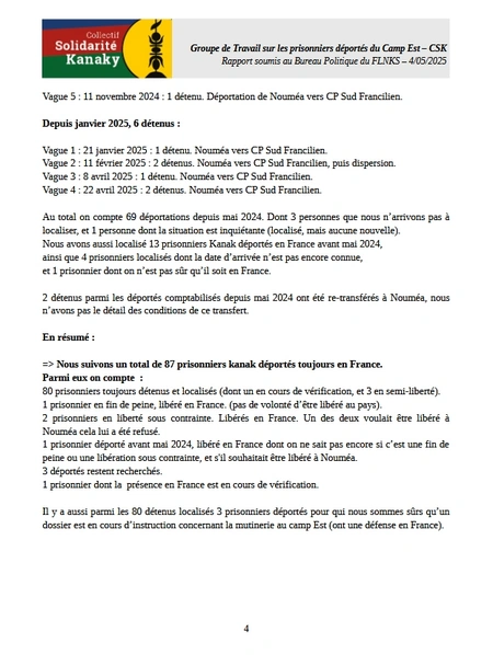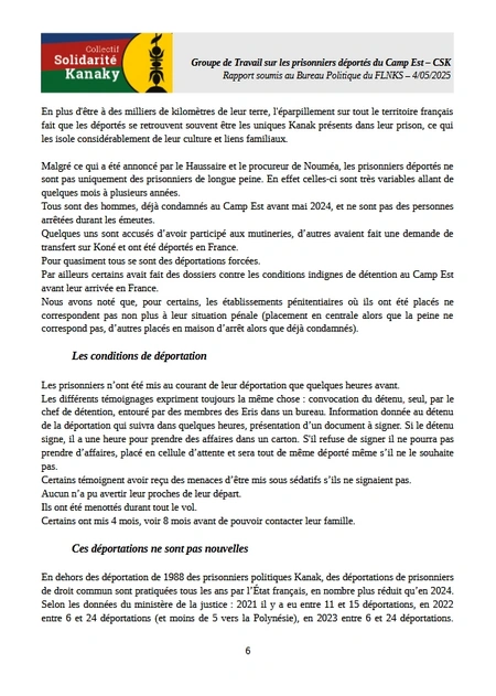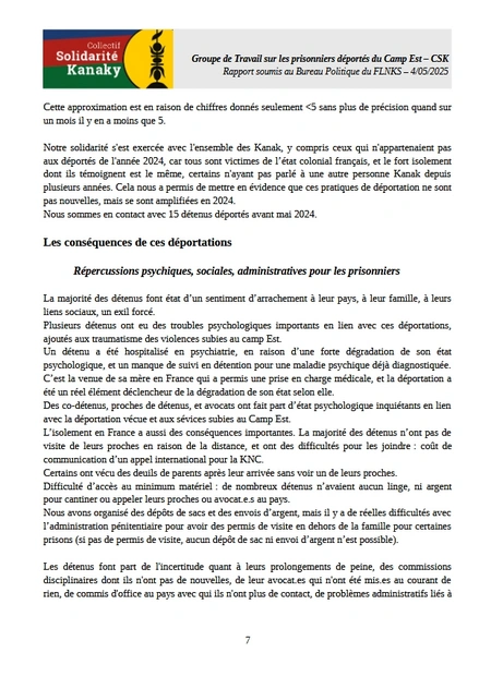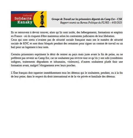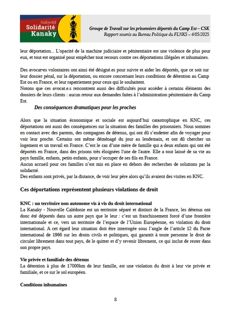 The report also highlights that by forcibly deporting Kanak prisoners, France is in violation of international law. According to international legal standards, Kanaky is not considered part of France’s national territory but is listed among the non-self-governing territories that must undergo decolonization. Therefore, when France deports Kanaks, it is effectively sending them from their own country—Kanaky—to a foreign state, i.e., France.