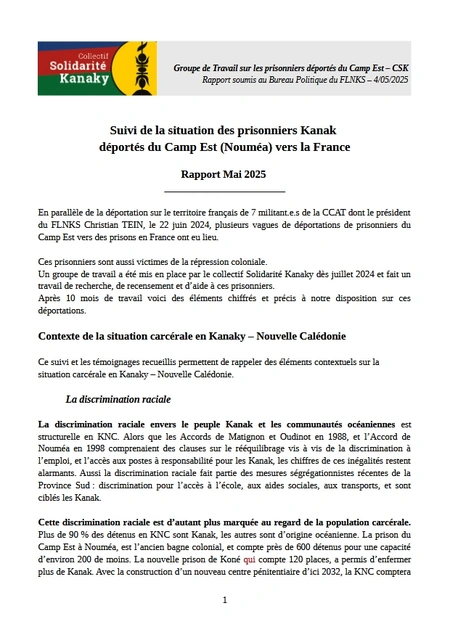 France continues its repressive actions against the independence movement in New Caledonia. In May of this year, the “Collectif Solidarité Kanaky” (Solidarity with Kanaky Collective) published a report detailing the situation of Kanak political and other prisoners who have been forcibly deported to France. It covers the period from June of last year to May of this year, documenting the registration, monitoring, and support efforts provided to the prisoners and their families.