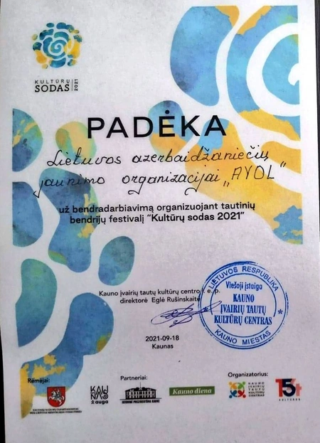 At the end of the festival, AYOL was awarded the prize of the Kaunas Cultural Center for active promotion of Azerbaijani culture in Lithuania and contribution to strengthening friendship between peoples.
