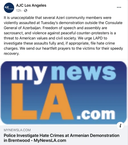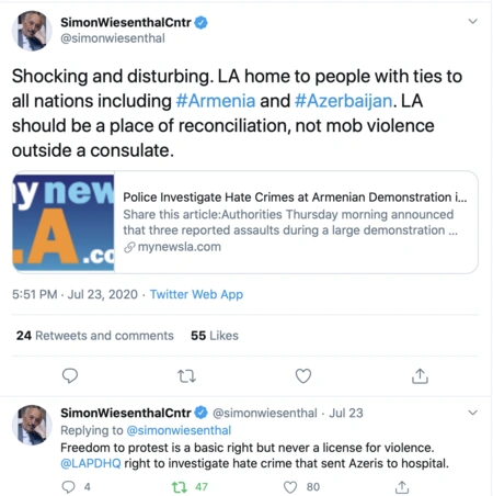 Simon Wiesenthal Center stated: “Shocking and disturbing. LA is home to people with ties to all nations, including Armenia and Azerbaijan. LA should be a place of reconciliation, not mob violence outside a Consulate. Freedom to protest is a basic right but never a license for violence. LAPD right to investigate a hate crime that sent Azeris to hospital.”