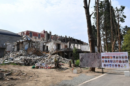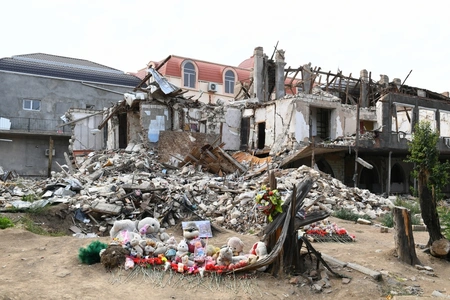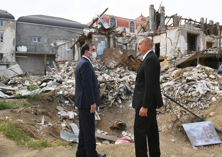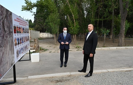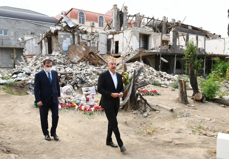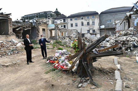 After familiarizing himself with the traces of Armenian fascism, President Ilham Aliyev laid flowers around the completely destroyed residential buildings as a sign of respect for the memory of the killed civilians.
