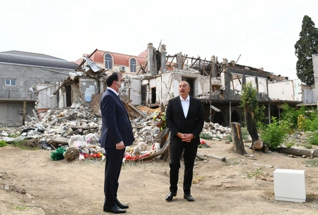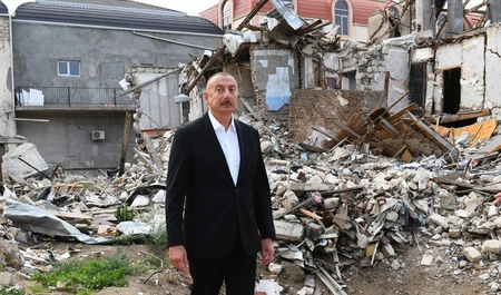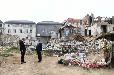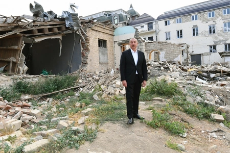 Ilham Aliyev views crime scenes caused by Armenia's missile attacks on Ganja