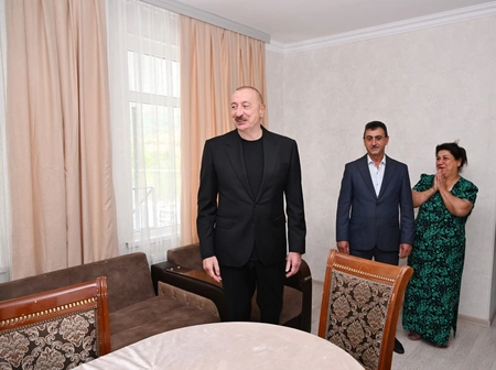 The head of state visited the home of Barat Novruzov, one of the residents who relocated to the village, and engaged in conversation with the family members.