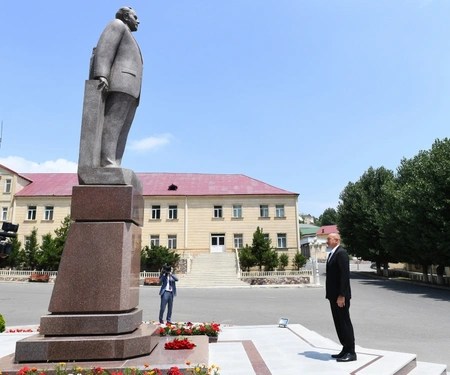 According to Report, the head of state laid flowers at a statue of national leader Heydar Aliyev in the city of Dashkasan.