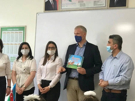 Head of the EU Delegation Kestutis Jankauskas presented the school with the book “European Fairy Tales.” This book is a collection of folk tales from 27 countries of the European Union. This book aims to raise awareness of the diversity of European culture and, at the same time to instill a sense of belonging to shared values and common European heritage. Jankauskas noted that he remembers how he sat at the desk just like those children, adding that, especially in these years, after so many changes, this is a new opportunity for the future generation and the Azerbaijani society.