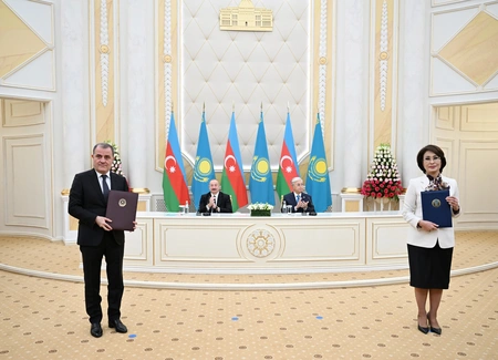 Azerbaijan's Minister of Foreign Affairs Jeyhun Bayramov and Kazakhstan"s Minister of Internal Affairs Yerzhan Sadenov exchanged the "Agreement on Cooperation between the Ministry of Internal Affairs of the Republic of Azerbaijan and the Ministry of Internal Affairs of the Republic of Kazakhstan."