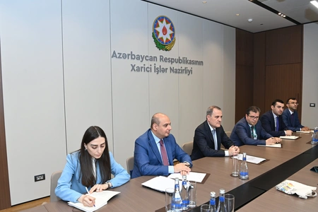 Report informs that she met with Foreign Minister Jeyhun Bayramov.