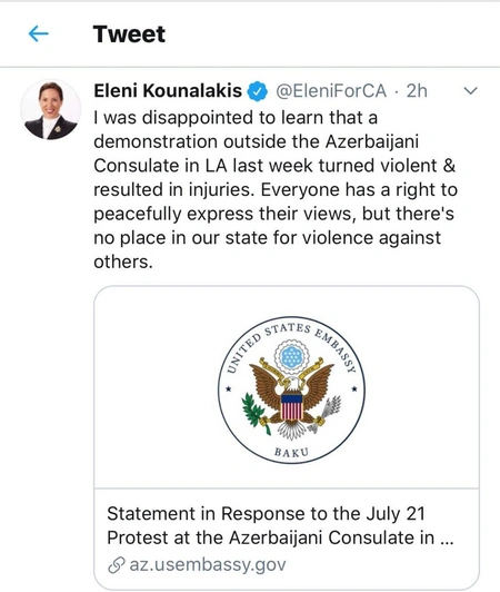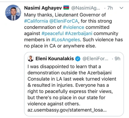 In her Twitter post, she noted: "I was disappointed to learn that a demonstration outside the Azerbaijani Consulate in LA last week turned violent and resulted in injuries. Everyone has a right to express their views peacefully, but there's no place in our state for violence against others."