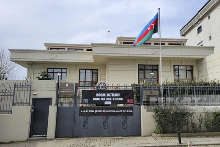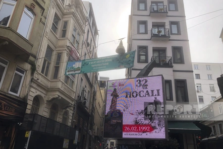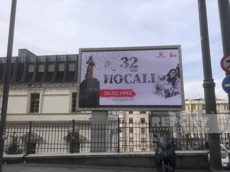 Images depicting the Khojaly genocide are displayed on monitors installed in Istanbul streets, Türkiye.
