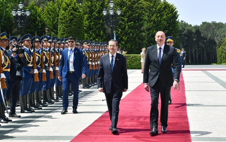 The military orchestra played the national anthems of Azerbaijan and Israel. The presidents reviewed the guard of honor.