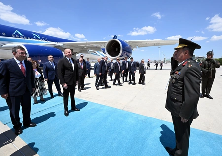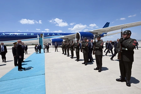 A guard of honor was lined up for the President of Azerbaijan at Ankara Esenboğa Airport decorated with the national flags of the two countries.