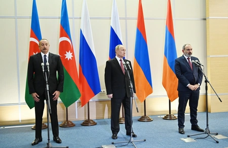 - In conclusion of our trilateral meeting, I would like to once again thank my colleagues, the President of Azerbaijan and the Prime Minister of Armenia, for agreeing to come to Russia today and discuss the situation that is developing at this point in time regarding the settlement of the Karabakh problem and the whole region. We – and I should say this from the very beginning – worked very constructively today. It was a deep analysis of the situation that has developed today. We have paid tribute to the work of our Russian peacekeepers, border guards, the specialists engaged in mine clearance to ensure the return of people to their permanent places of residence.