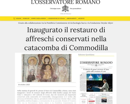 The Holy See's media outlets write about the opening of the restoration project for the Catacombs of Saint Commodilla, which took place on October 16 with the participation of First Vice President of Azerbaijan Mehriban Aliyeva, Report informs.