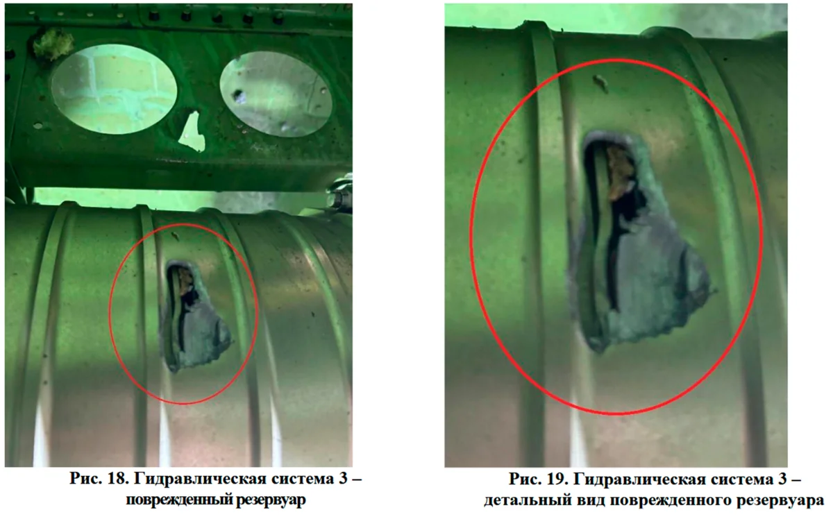 "Due to adverse weather conditions the aircraft unsuccessfully attempted to land in Grozny two times, and then the captain decided to return to Baku. Following this decision, the (CVR) recorded two external noises, occurring with 24 seconds interval, over Grozny. Analysis of the CVR and FDR data showed that 4 seconds after the first external noise the 3rd hydraulic system failed, followed by the failure of the 1st hydraulic system 6 seconds later, and the 2nd hydraulic system 21 seconds later," reads the report.