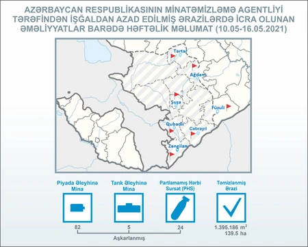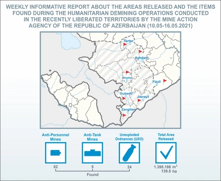 Report informs, citing the information, that 82 antipersonnel mines, five anti-tank mines, and 24 unexploded ordnance detected and neutralized during search operations in Tartar, Aghdam, Fuzuli, Shusha, Gubadli, Jabrayil, and Zangilan on May 10-16.