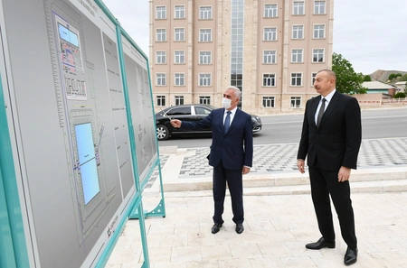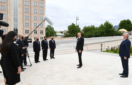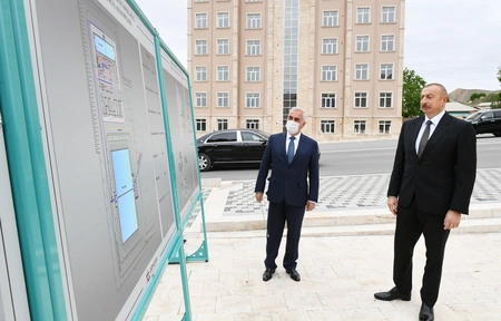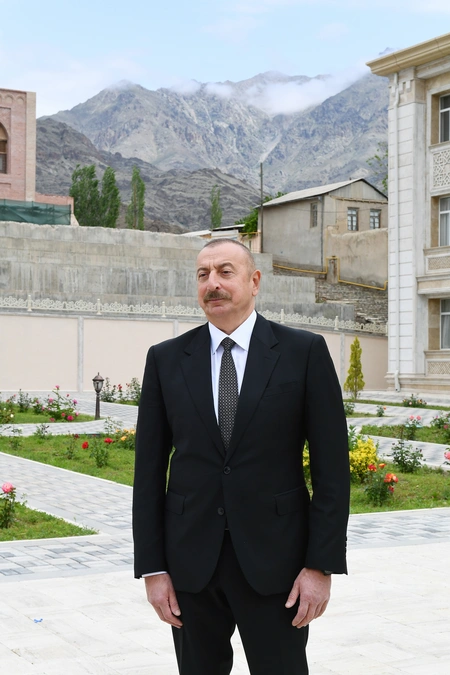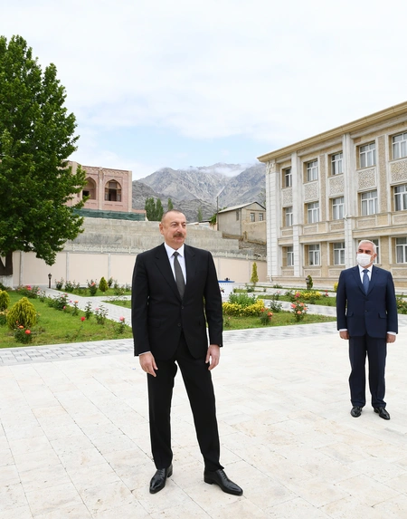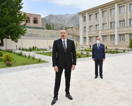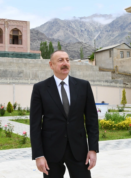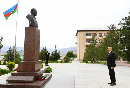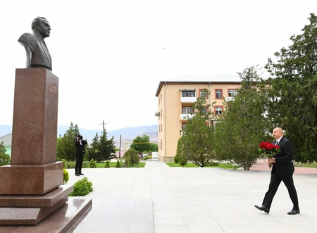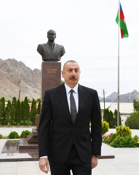 President Ilham Aliyev then put flowers at a bust of national leader Heydar Aliyev in the city of Ordubad.