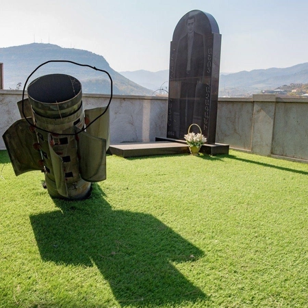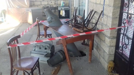 "Photo 1: Alasgarli village of Azerbaijan's Tartar region came under fire from Armenia. I shared it as a photo of the day. Engine part of Armenian Smerch missile penetrates the table and enters the ground.