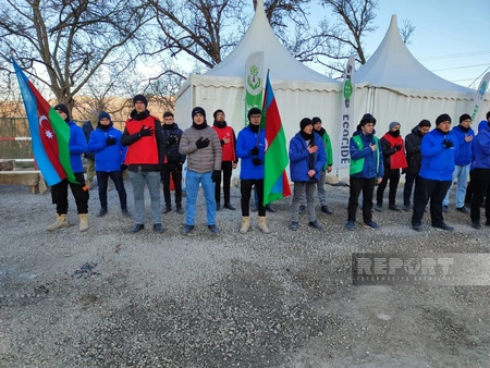 At the same time, eco-activists raise posters written in Azerbaijani, Russian, and English on both sides of the road and chant slogans calling to end ecocide.