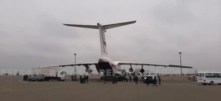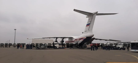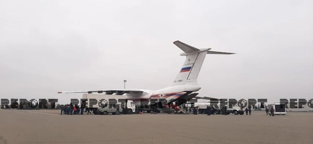 Aircraft, bringing bringing 20-member specialists of the Russian Ministry of Emergency Situations (MES), has landed at Ganja airport to perform demining process in the liberated territories of Nagorno-Karabakh.