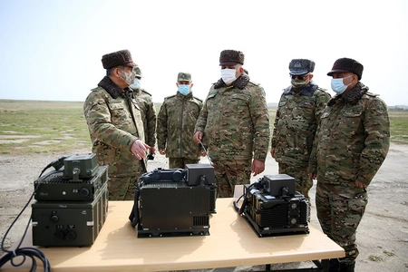 The Minister of Defense, Colonel General Zakir Hasanov, who arrived in the mission area on April 7 to watch the following stage of the exercises, visited the field command posts deployed on the terrain and inquired about the organizing and progress of the training. The most modern tactical and strategic communications equipment available in the armament of our units was demonstrated to the Minister of Defense.