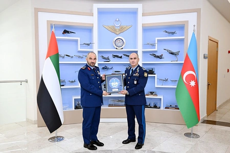 The Deputy Minister of Defense of the Republic of Azerbaijan – Commander of the Air Force, Lieutenant General Namig Islamzade, met with a delegation led by the Commander of the United Arab Emirates Air Force and Air Defense, Major General Rashed Mohamed Al Shamsi, who is on a visit to Azerbaijan, Report informs, referring to the Ministry of Defense.
