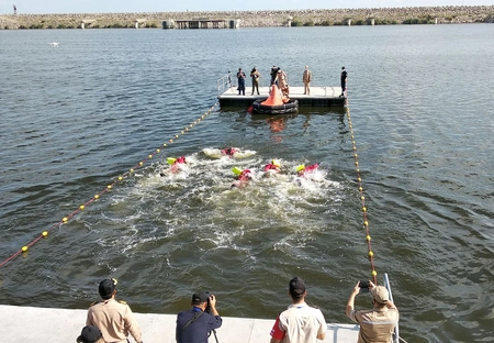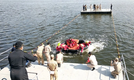 At this stage, the military seamen in teams of five people, wearing special rescue suits, covered a certain distance and using boats were taken to their destination.