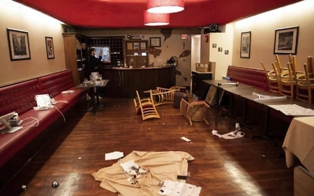 The defendants are accused of throwing chairs at the fleeing customers, some of whom suffered injuries from the attack, prosecutors said. The group left about $20,000 in damage to the restaurant as they fled before police arrived.