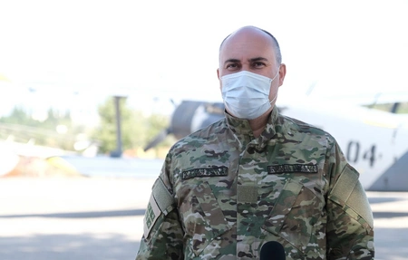 Defense Minister Juansher Burchuladze joined a parachute jump with the military to boost their fighting spirit. The jump was made from a modernized AN 2 aircraft.
