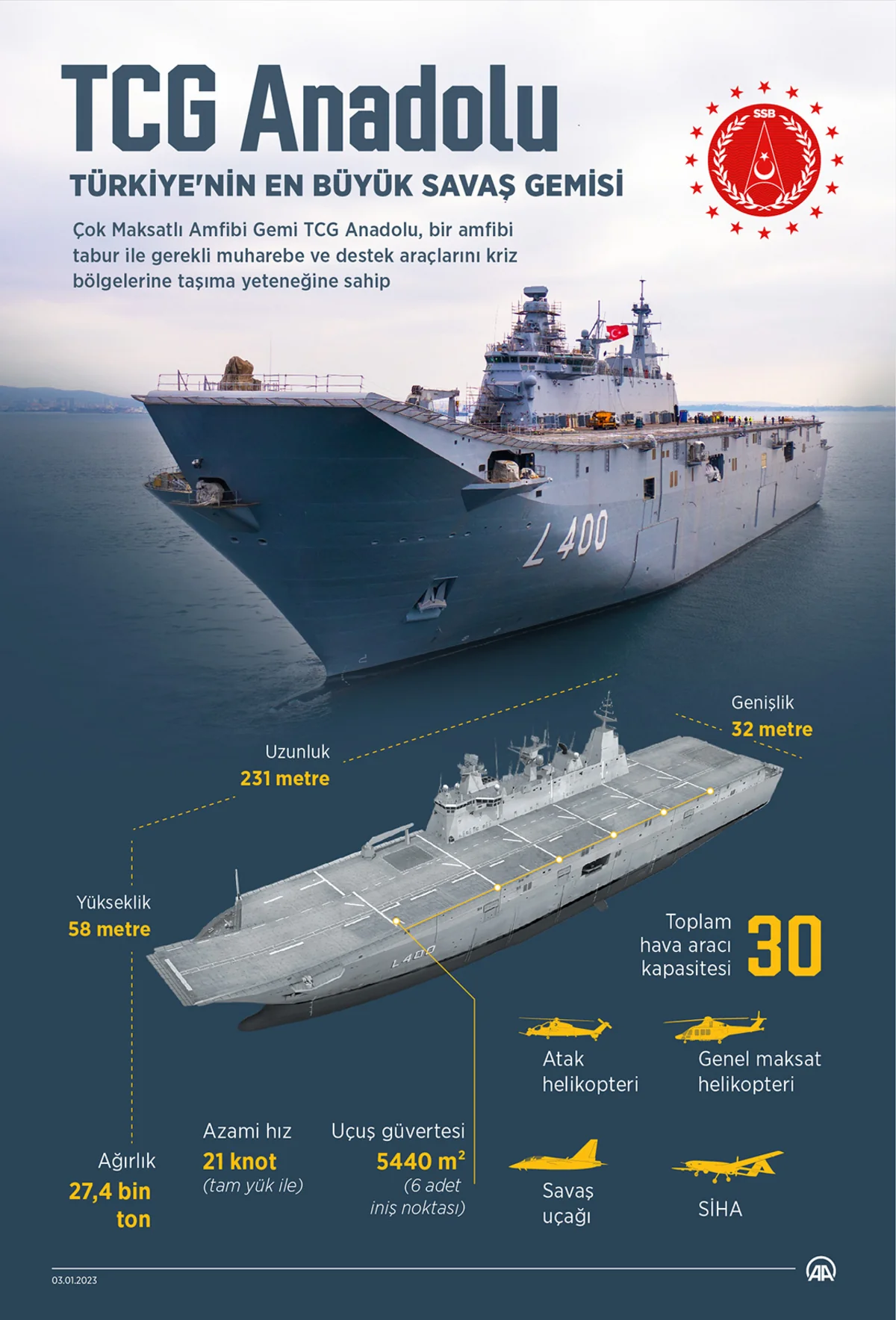 The TCG Anadolu is 231 meters long and 32 meters wide. When fully equipped, it will weigh 27,436 tons.