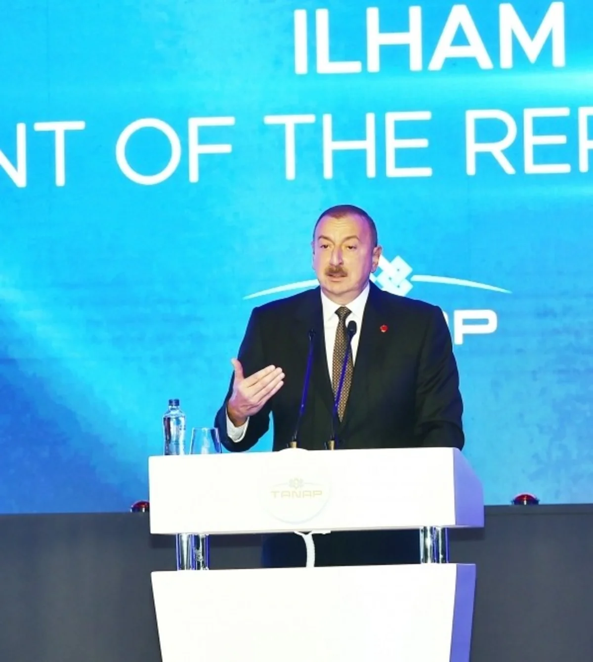 "Dörd il əvvəl Qars şəhərində əziz qardaşım Prezident Ərdoğanla birlikdə TANAP-ın təməlini qoyduq. Ancaq TANAP-a aparan yol 2012-ci ildə başlamışdır. Tarixi İstanbul sazişi nəticəsində TANAP-ın yaşıl işığı yandırıldı. Tarixi İstanbul anlaşması Türkiyə və Azərbaycanın birgə siyasi iradəsi nəticəsində mümkün olmuşdur. Çünki TANAP haqqında bu qərarın qəbul edilməsinə qədər Azərbaycan qazının Türkiyə və ondan sonra Avropaya nəql edilməsi ətrafında bir neçə il çox böyük müzakirələr aparılmışdır, ancaq heç bir nəticə verməmişdir. Belə olan halda əziz qardaşım Rəcəb Tayyib Ərdoğanla birlikdə qərara gəldik ki, bizə lazım olan bu nəhəng layihəni özümüz həyata keçirək və belə də oldu. Bu gün bu layihəyə qoşulan BP şirkəti bizim tərəfdaşımızdır. Ancaq əsas texniki və maliyyə yükünü Azərbaycan və Türkiyə öz üzərinə götürmüşdür.