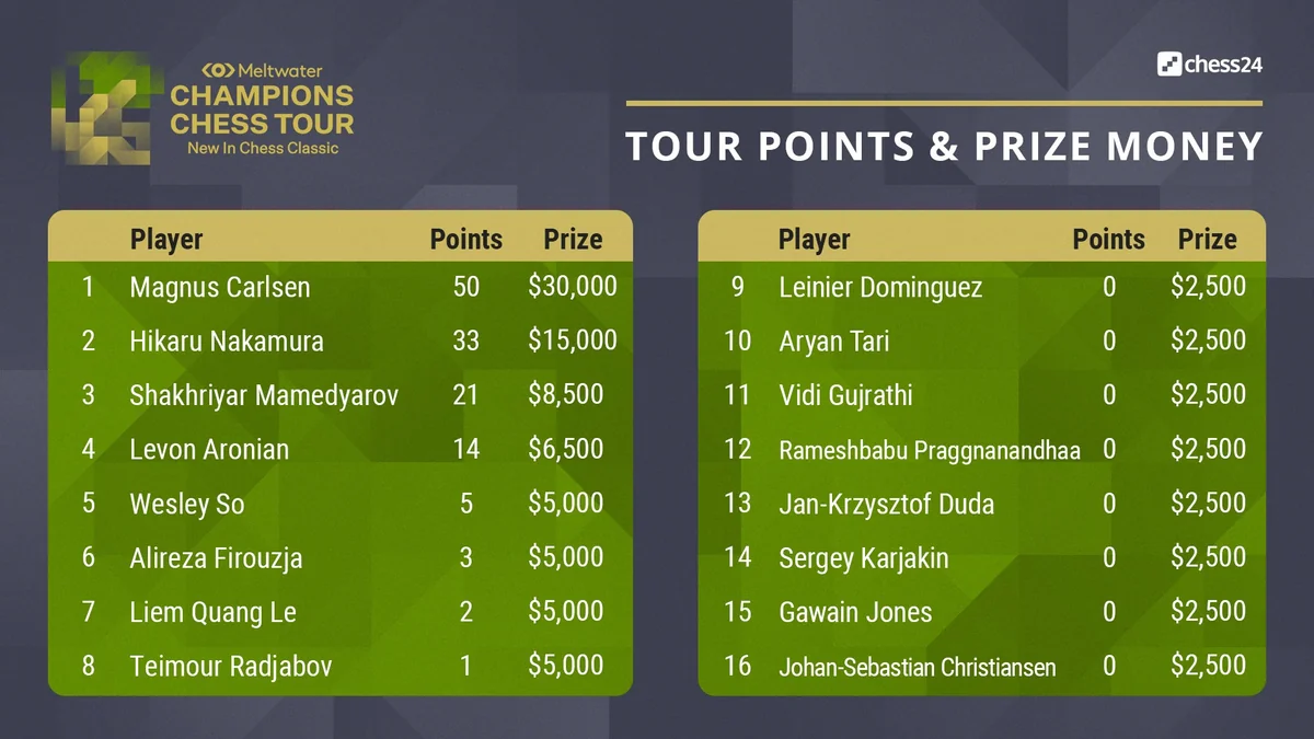 Norveçli dünya çempionu Maqnus Karlsenin təşkil etdiyi Çempionlar Turunun 5 raundundan sonra turnir cədvəli açıqlanıb.