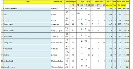 "Report" IFFHS-ın rəsmi saytına istinadən xəbər verir ki, siyahının ilk pilləsində Portuqaliya yığmasının və İtaliya "Yuventus"unun hücumçusu Kriştianu Ronaldu qərarlaşıb. 36 yaşlı forvard 766 qola imza ataraq braziliyalı əfsanəvi futbolçu Peleni (765 qol) geridə qoyub. Üçüncü sırada 753 qolla Pelenin həmyerlisi Romario yer alıb.