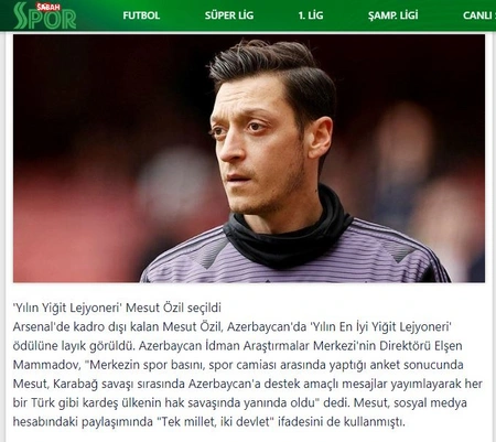 Türkiyə mətbuatı İngiltərənin "Arsenal" klubunun futbolçusu Mesut Özilin Azərbaycanda İLİN DÖYÜŞKƏN LEGİONERİ seçilməsindən yazıb.