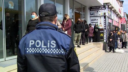 Tədbirlər çərçivəsində insanların sıx toplaşdığı bank və digər obyektlərin qarşısında sosial məsafənin gözlənilməsi polis əməkdaşları tərəfindən təmin edilib.